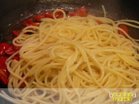 nel frattempo cuocere la pasta e versarla nel tegame dove è stato preparato il sugo, far insaporire sul fuoco