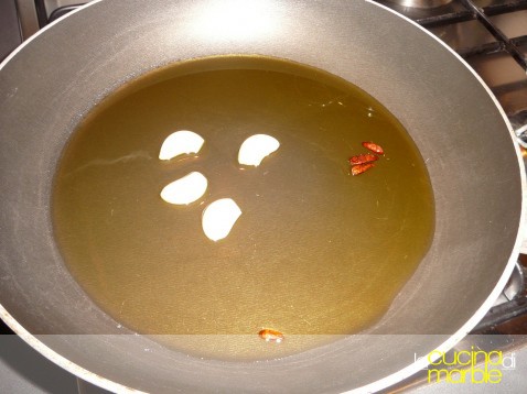 far rosolare in olio spicchi d'aglio tagliati in due e peperoncino a piacere