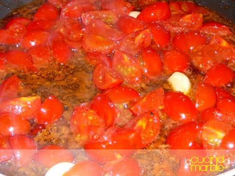 versare i pomodori nel tegame e far cuocere pochissimi minuti (devono solo appassire leggermente)