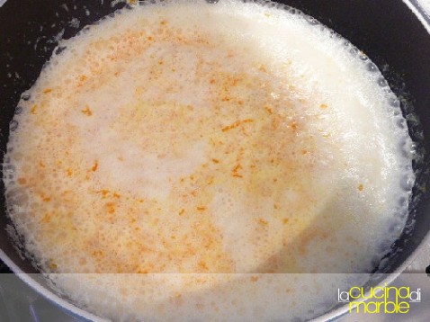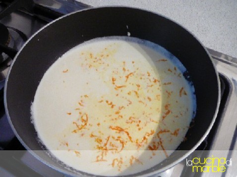 unire la panna, il latte e la scorza d'arancia in un tegamino. portare ad ebollizione e lasciare in infusione e a freddare leggermente