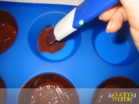 sciogliere la cioccolata fondente e rivestire con questa degli stampi da muffin