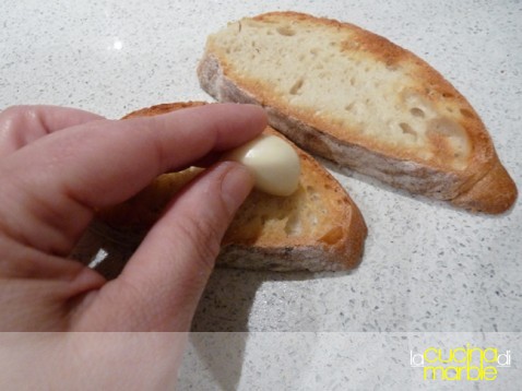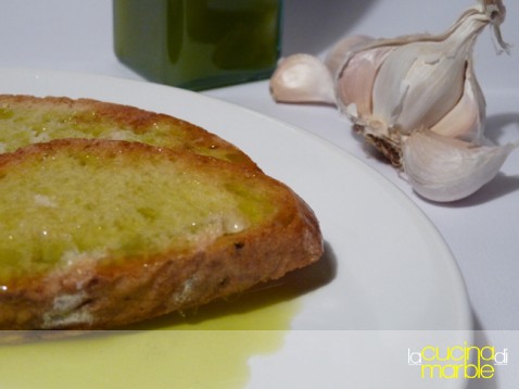 tostare le fette di pane -meglio sarebbe su una griglia- sbucciare l'aglio e passarlo sulle fette di pane ancora calde, sopra abbondante olio d'oliva e, a piacere, sale