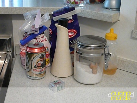 passato questo tempo di maturazione, procedere con l'impasto aggiungendo la birra, l'olio, il miele la farina ed il sale