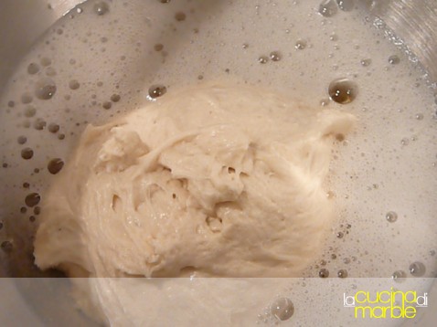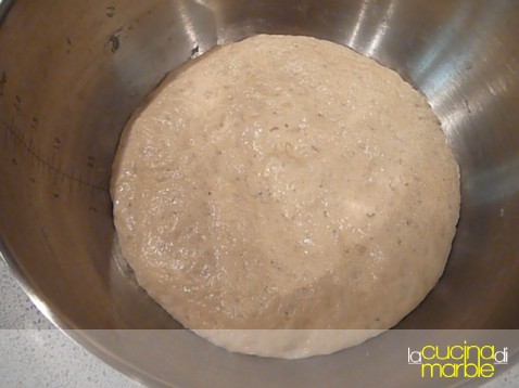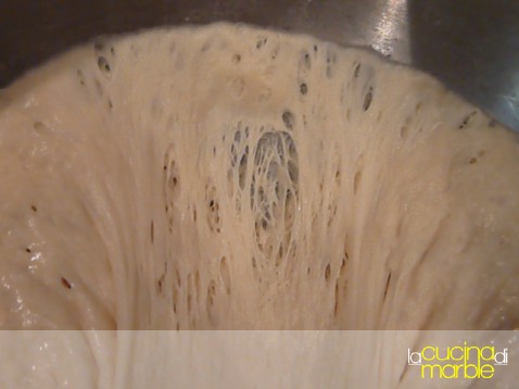 dopo due ore e mezza è gonfiato ancora un po' e si intravedono gli alveoli di lievitazione
