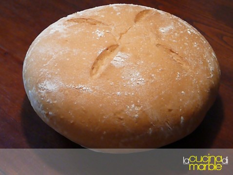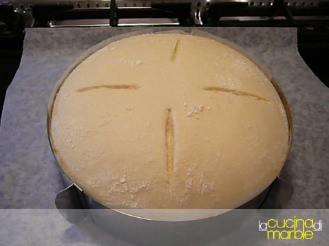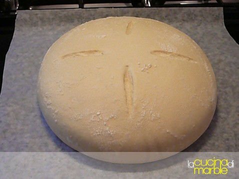 passarlo sulla teglia di cottura e dopo altri 20' di riposo l'ho "circondato" con un anello da pasticceria (frapponendo della cartaforno tra il cerchio ed il pane) in modo che la lievitazione andasse in altezza e non in larghezza