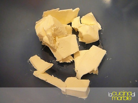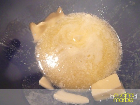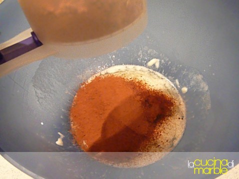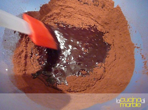 aggiungere al burro fuso il cacao setacciato e lo zucchero, amalgamare bene