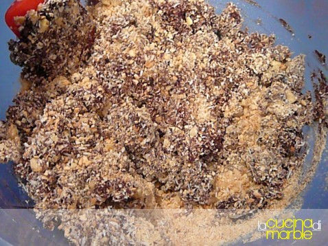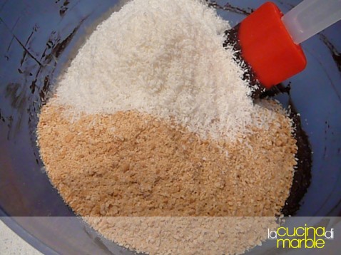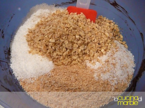 una volta amalgamato bene l'uovo, aggiungere i biscotti tritati, il cocco e le noci tritate