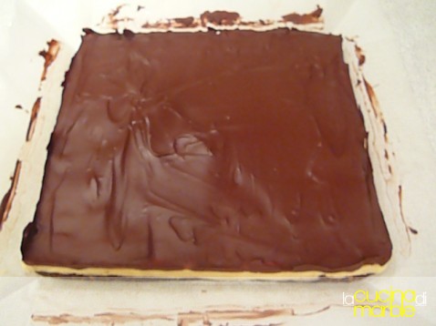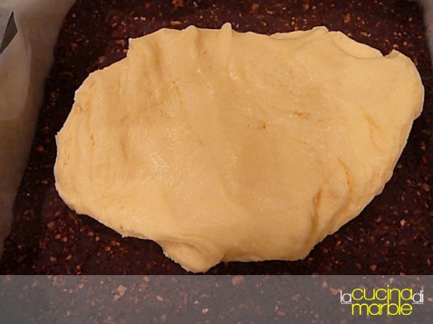 disporre in modo omogeneo questo impasto sullo strato precedentemente preparato, regolarizzare le altezze e riporre nuovamente in frigo a solidificare