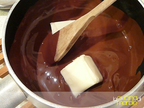 far stiepidire un attimo e aggiungere il burro, mescolare continuamente fino a che il burro non sarà fuso e il cioccolato bello lucido, eventualmente passare anche al minipimer ;)