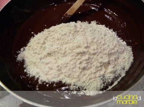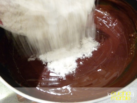 una volta ottenuto un composto omogeneo, aggiungere la farina già mischiata al lievito e amalgamare di nuovo il tutto