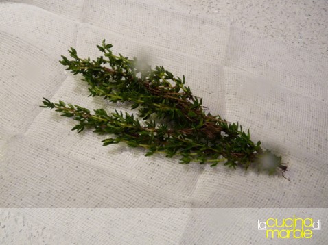un bouquet di erbe medio: 4 rametti di prezzemolo, ½ foglia di alloro (io ne ho messe 3, mi piace!), un cucchiaino di foglie di timo