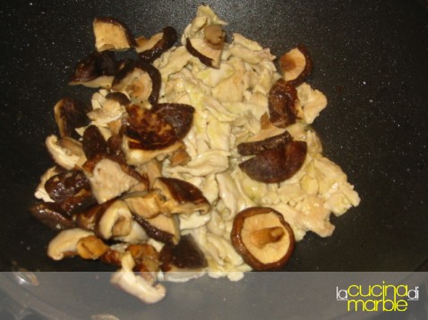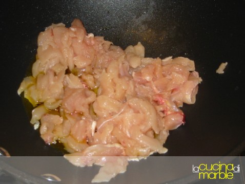 tagliare a listarelle il pollo e farlo appena rosolare in olio caldo in una padella (possibilmente tipo wok)