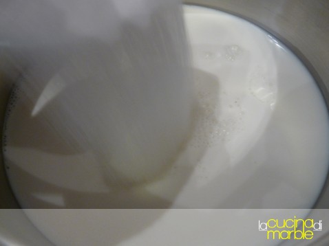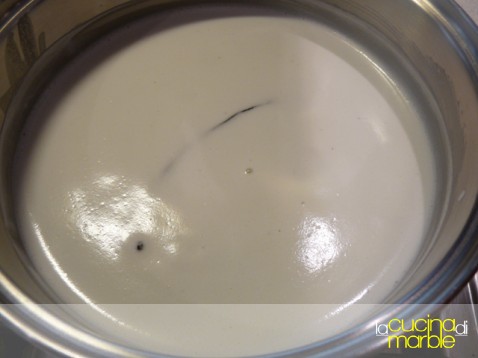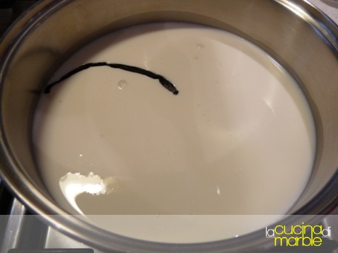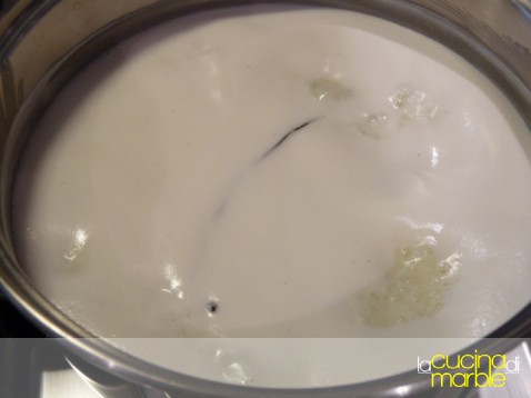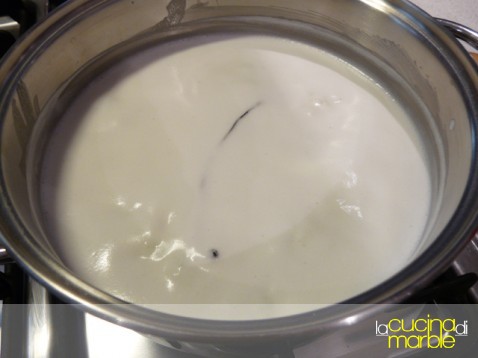 mettere in un tegame il latte, aggiungere 250 gr di zucchero e la stecca di vaniglia (magari incisa per la lunghezza)