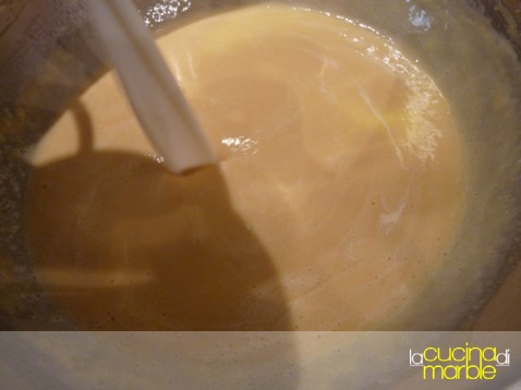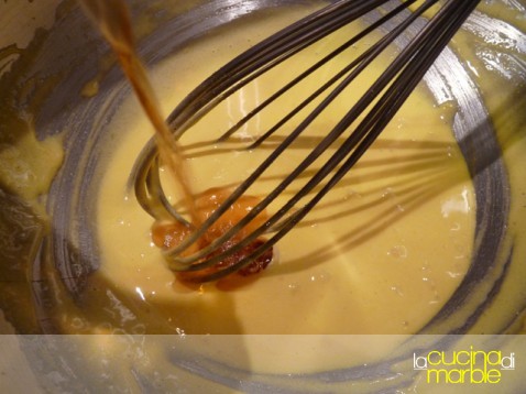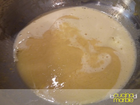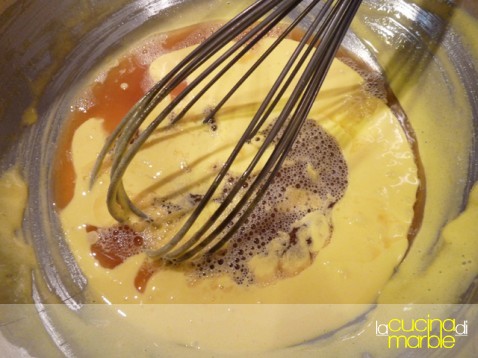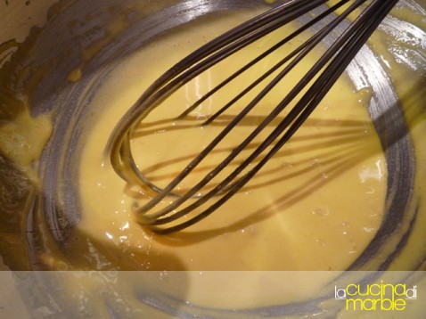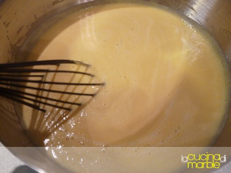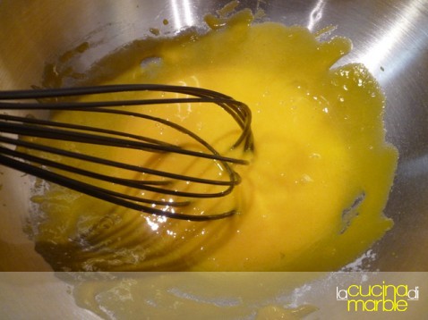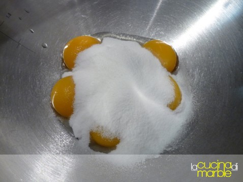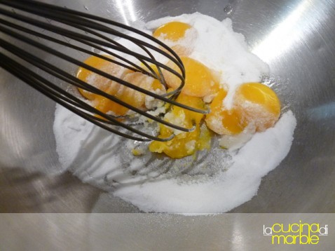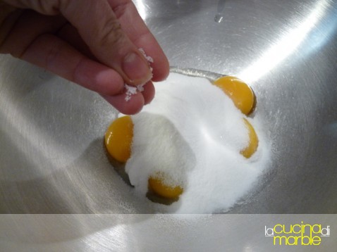 ed ora i passaggi finali, sbattere insieme i tuorli con lo zucchero ed un pizzico di sale, come se si facesse uno zabaione, fino a che lo zucchero non sarà sciolto