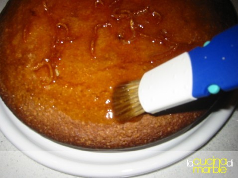 preparare lo sciroppo di copertura mettendo i 150 gr di zucchero rimasto con il succo dell'altro limone, altrettanta acqua e la scorza tagliata a lamelle