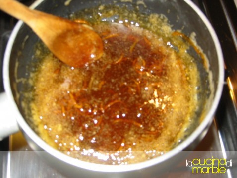 cuocere a fuoco bassissimo fino a che il liquido non sarà quasi del tutto evaporato e il composto inizierà a caramellare