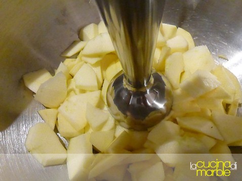 riporle in un ampio contenitore e, con l'aiuto di un minipimer (o anche nel passatutto a fori fini come faceva nonna Eugenia), ridurre in purea le mele