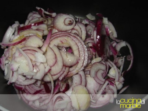far appassire le cipolle tagliate a fette spesse in olio, aggiungere del pomodoro, salare e portare a cottura