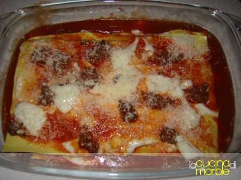 uno strato di lasagne, altra besciamella, altro sugo e una spolverizzata di parmigiano grattugiato